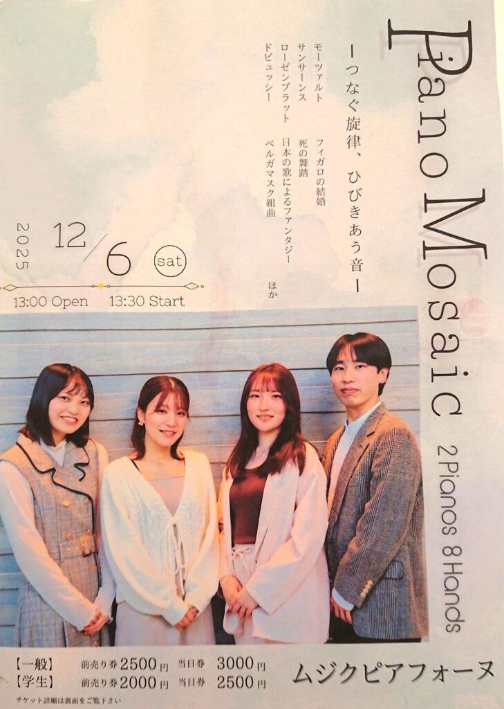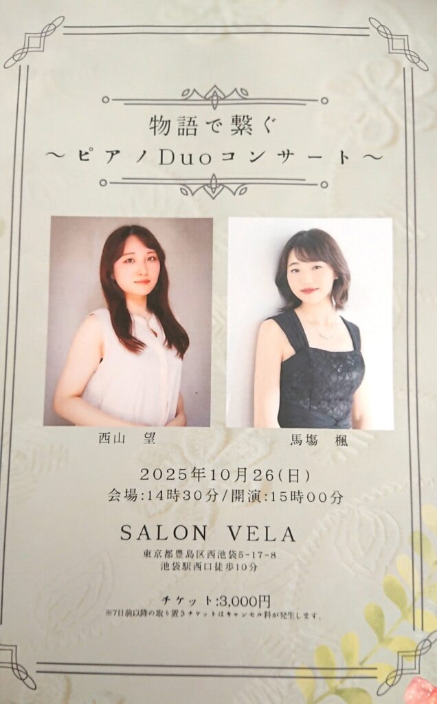 のぞみ先生がコンサートに出演します② Posted on 2025年9月29日2025年9月29日 by ongakunomori 松戸教室土曜日と流山教室月曜日担当の のぞみ先生がコンサートに出演いたします。 日程は10月26日(日)、12月6日(土)になります。 ご都合が合いましたら是非お越しください。 チケットのお問い合わせは担当講師までお願いいたします。